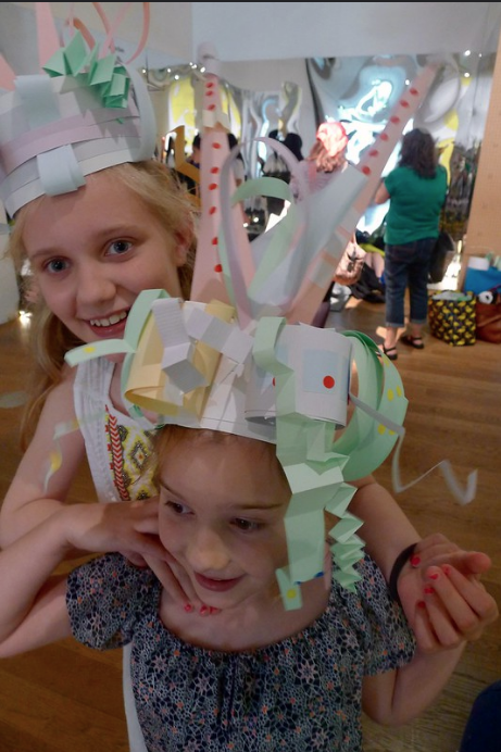 The workshop drew inspiration from MAG’s ‘Vogue 100: A Century of Style’ exhibition and encouraged participants to experiment with form and movement. We used simple paper shapes to construct headdresses through which they could shift and change their shapes and explore different identities.